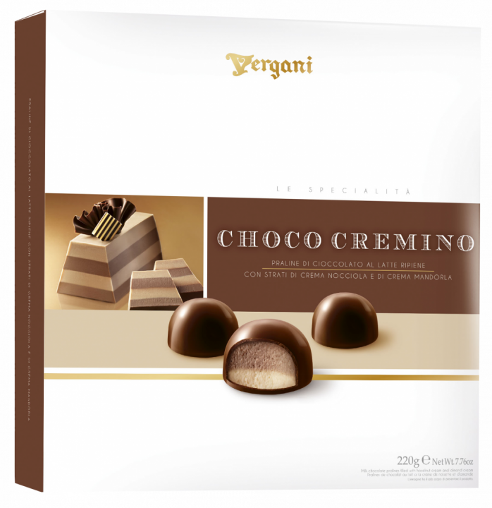 57081 – Čokoládové pralinky CHOCOCREMIO plnené vrstvami krému z lieskových orieškov (23%) a mandlí (35%) poliate mliečnou čokoládou