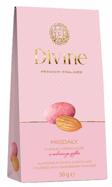 AH DIVINE mandle v bielej čokoláde pokryté malinovým práškom