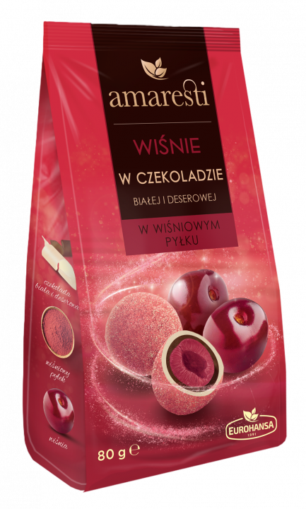 Šťavnatá čerešňa je obalená dvoma druhmi čokolády: vo vnútri sladkou bielou čokoládou a zvonku aromatickou tmavou čokoládou. Celá čerešňa je obalená jemným čerešňovým práškom, ktorý zvýrazňuje chuť výrobku a dodáva mu jedinečnú, rafinovanú farbu. PLU: 294 Balenie: 12ks / kartón Krajina pôvodu: Poľsko Hmotnosť: 80g